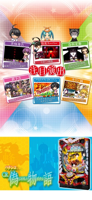 アニメ「偽物語」の世界観をパチンコ演出に昇華した『パチンコCR偽物語』が登場!確変スペックの前作から、パチンコとしてより分かりやすいゲーム性を求めたSTスペックに変更。大当り後100%突入する選べる3つのSTを搭載し、自分好みの演出でプレイすることができるぞ!