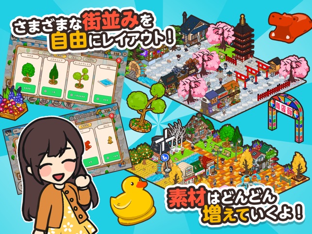 地面、街路樹、オブジェ、なんでも好きに置こう!知名度が上がると、新しいエリアに行けるようになるよ!