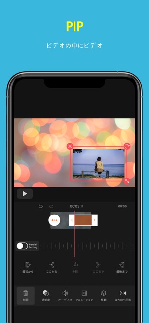 ▶動画編集:大きさ変更、倍速、逆方向、フィルター、補正、複製、切る等
