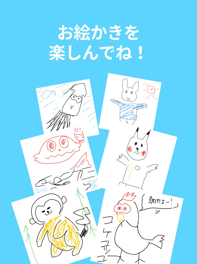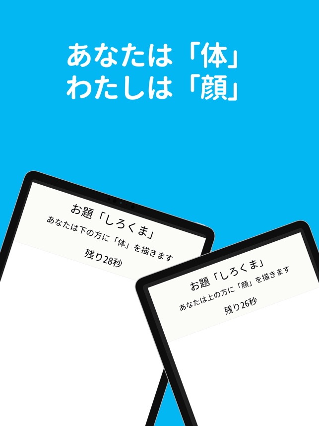 ・「顔」「体」のように分けて描いて遊びますひとりで描くのも楽しいけど、みんなで描くともっと楽しい、そんなアプリです!