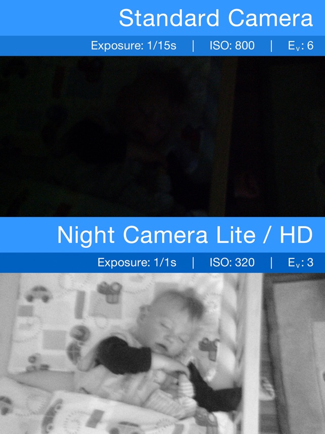 iPhone、iPad及びiPod touchには標準的なナイトビジョン機器に通常見られる赤外線増幅器がありません。その結果、カメラセンサーが確認できる最低限の光量が必要であり、暗闇で写真を取ることができません。 露出モードではプレビューにも遅れが生じます。さらに、露出時間中カメラを安定させる必要があります。