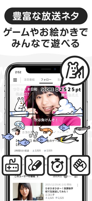 コメントやゲーム、画面を演出するギフトなどの機能を通じて、みんなで楽しく放送できます。