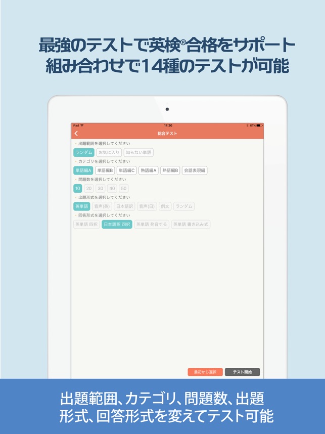 ・ 出題範囲、出題形式、回答形式などの組み合わせで最大14種のテストが可能です