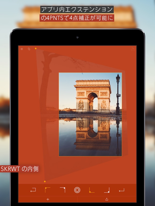 SRKWTのチームが遠近補正ワークフローを更新し、必須のエクステンション4PNTSを作り上げました。写真のプロ風変換への実践的なアプローチ:4PNTSでは手動で画像の一つ以上のコーナーポイントを操作でき、遠近補正を完全に直感的な操作プロセスに変えます。 4ポイント視点ツールは、アプリ内購入として利用可能です – これによりSKRWT内であなたの写真を芸術的変換、スキュー等で強化できます。