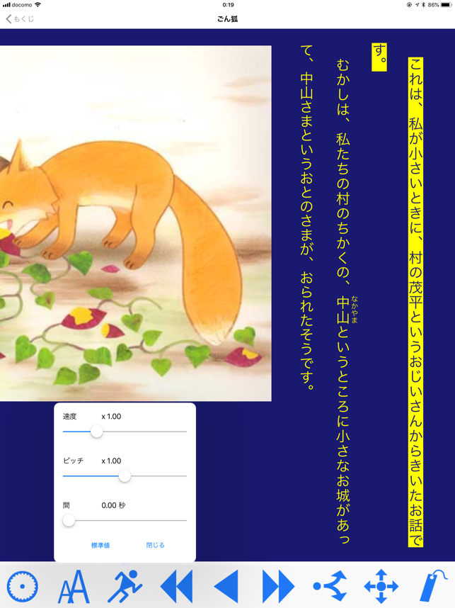 一方、音声データが含まれていない場合には、代わりに本文のテキストを合成音声で読み上げます。利用できる合成音声は、Siriで使われているiOSに組み込みの話者に加え、ドキュメントトーカーのたかし・けいこ・太郎・花子の話者も利用できます。
